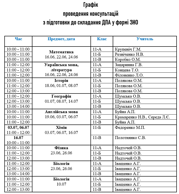 Графік проведення консультацій з підготовки до складання ДПА у формі ЗНО