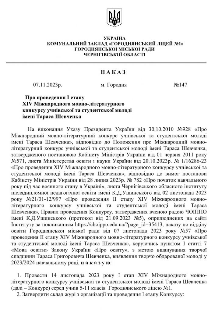 Наказ №147 Про проведення І етапу ХІV Міжнародного мовно-літературного конкурсу учнівської та студентської молоді імені Тараса Шевченка 14 Листопада, 2023 Накази, Новини