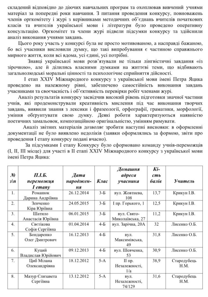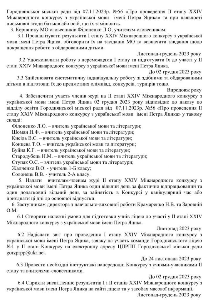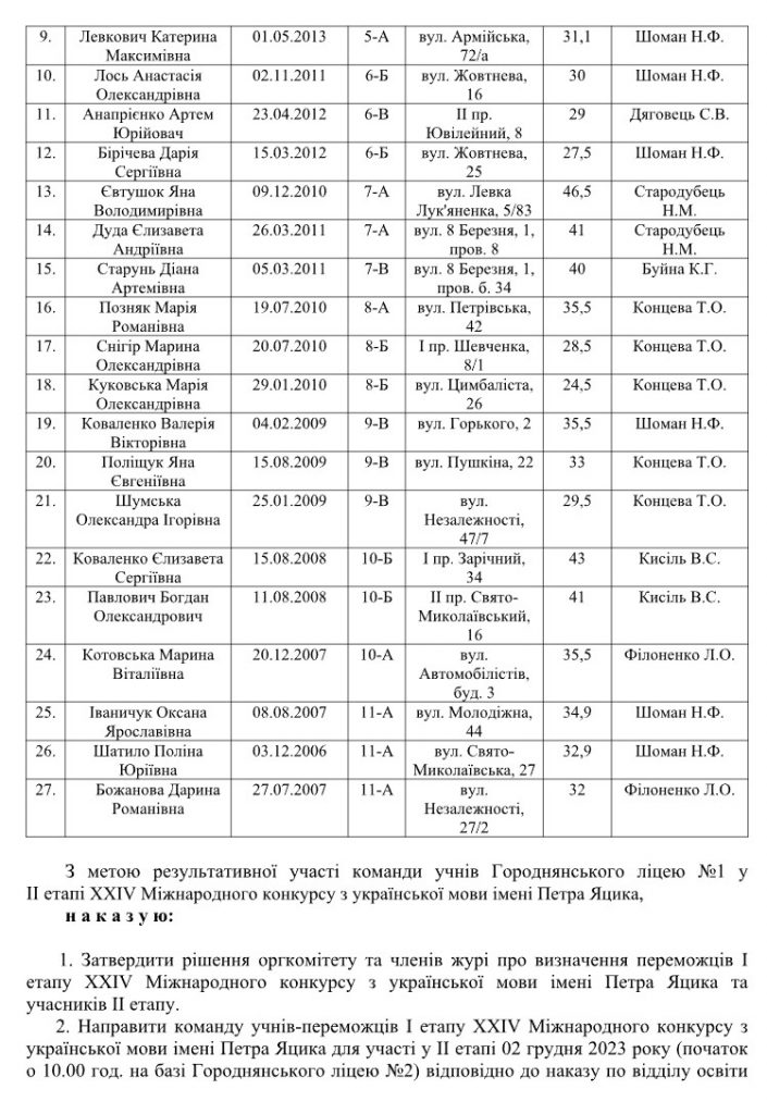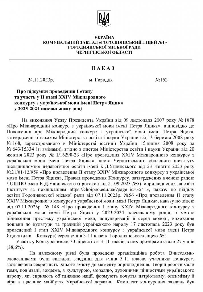 Наказ №152 Про підсумки проведення І етапу та участь і ІІ етапі XXIV Міжнародного конкурсу з української мови імені Петра Яцика у 2023-2024 навчальному році 29 Листопада, 2023 Накази, Новини