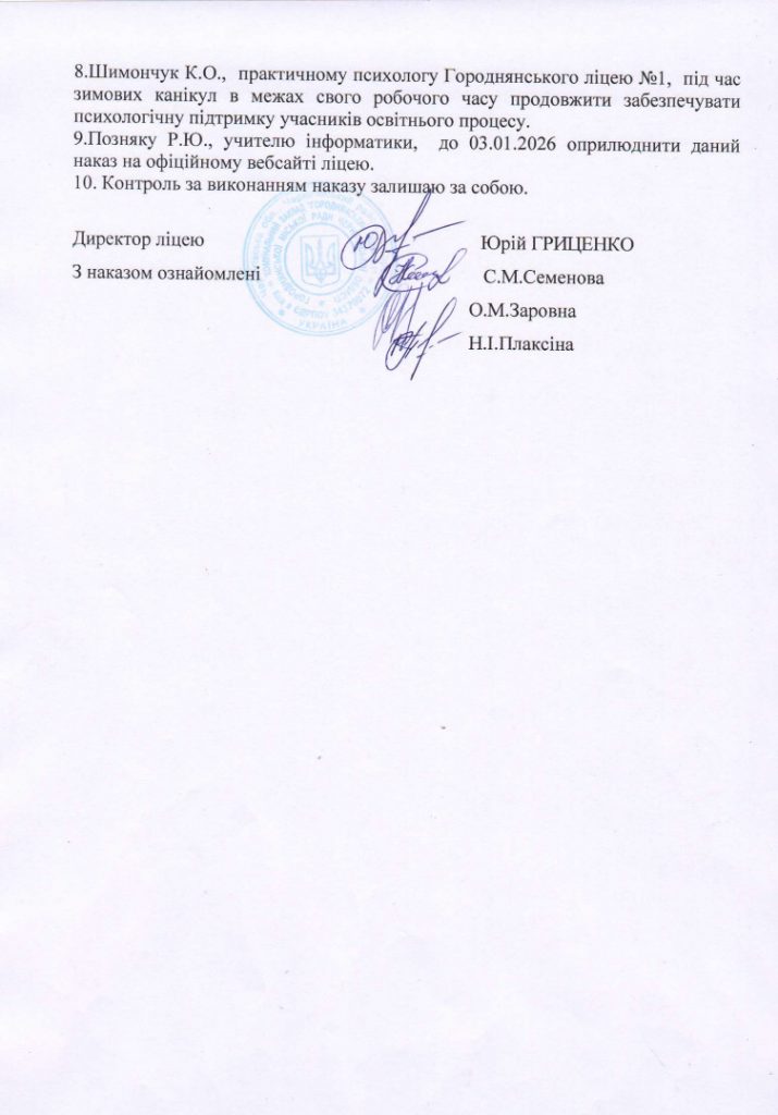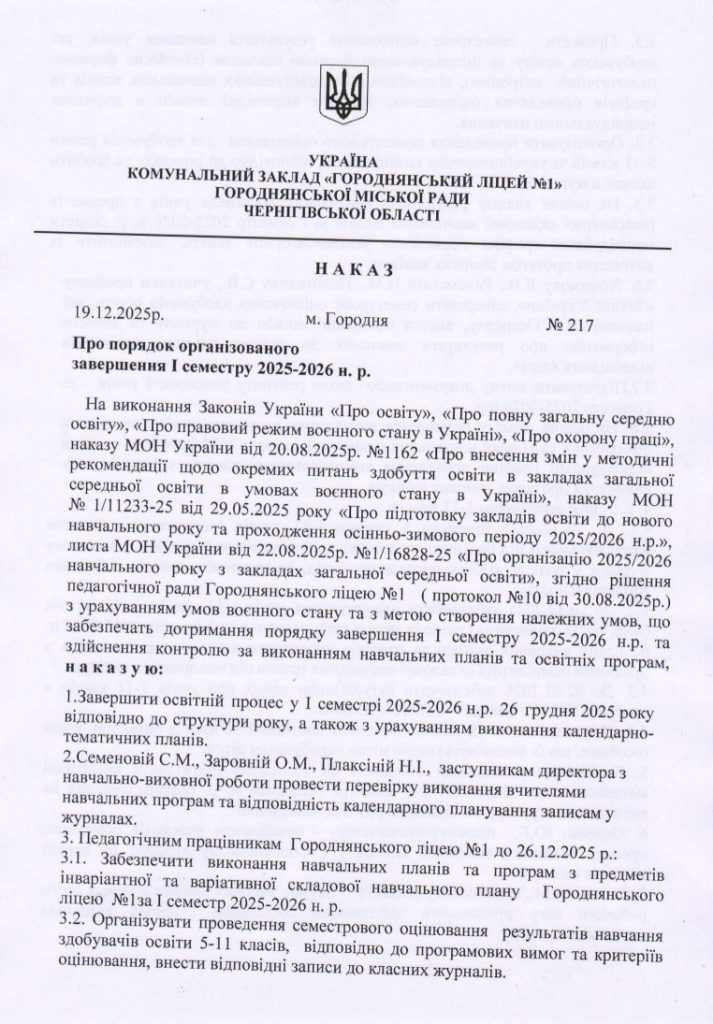 Наказ №217 Про порядок організованого закінчення І семестру 2025-2026 н.р. 31 Грудня, 2025 Накази, Новини