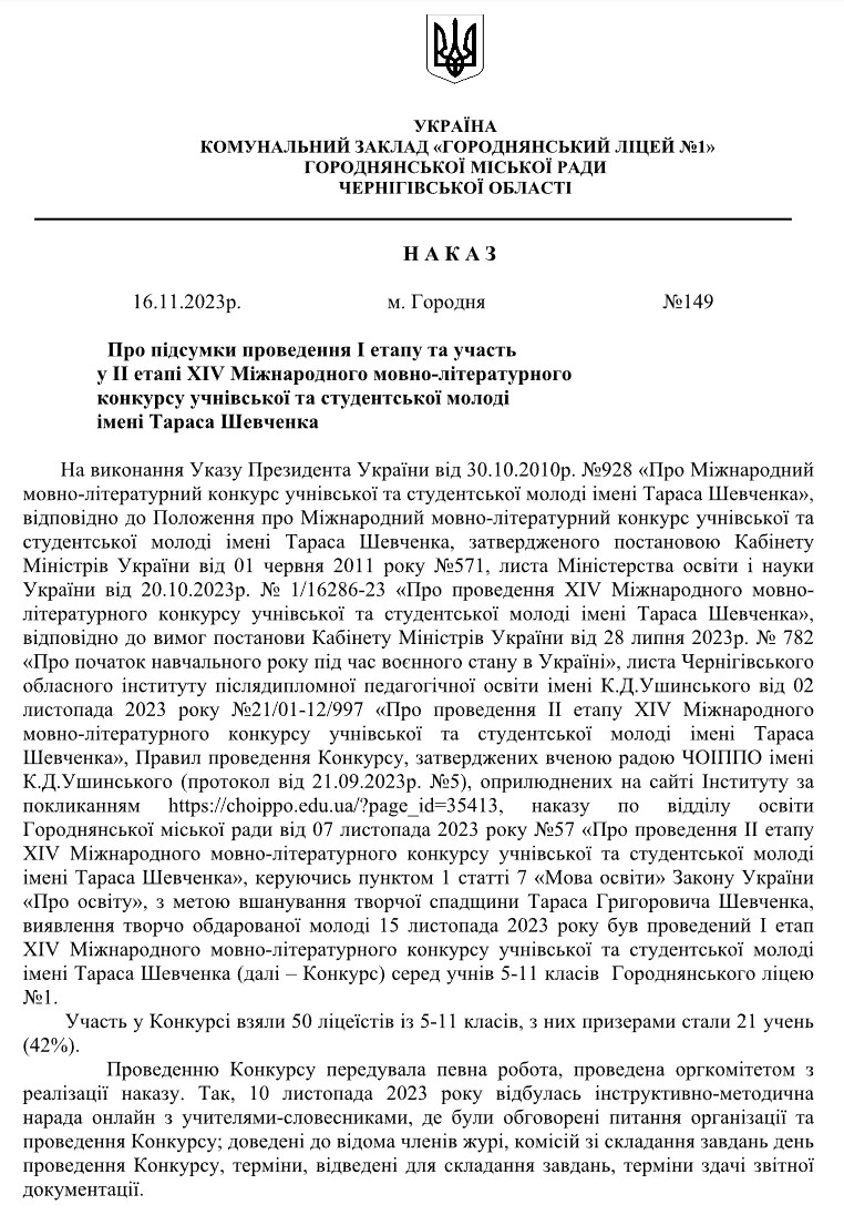 Наказ №149 Про підсумки проведення І етапу та участь у ІІ етапі XIV Міжнародного мовно-літературного конкурсу учнівської та студентської молоді імені Тараса Шевченка 21 Листопада, 2023 Накази, Новини Read more →