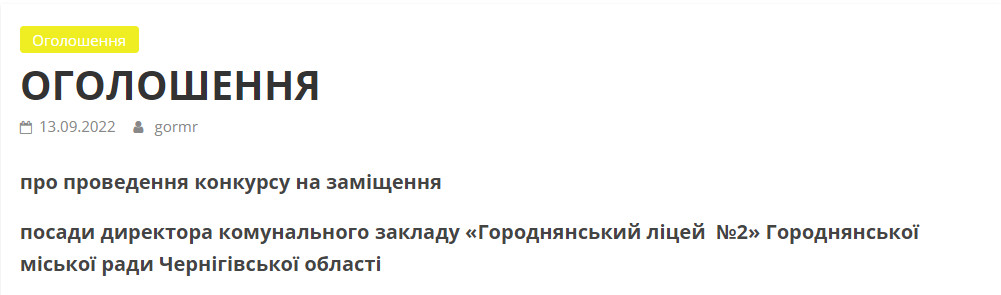 Read more →ОГОЛОШЕННЯ про проведення конкурсу на заміщення посади директора комунального закладу «Городнянський ліцей №2» Городнянської міської ради Чернігівської області Відділ освіти Городянської міської ради оголошує конкурс на заміщення посади директора комунального закладу «Городнянський ліцей №2» Городнянської міської ради Чернігівської області. Конкурс проводиться відповідно до Законів України «Про […]