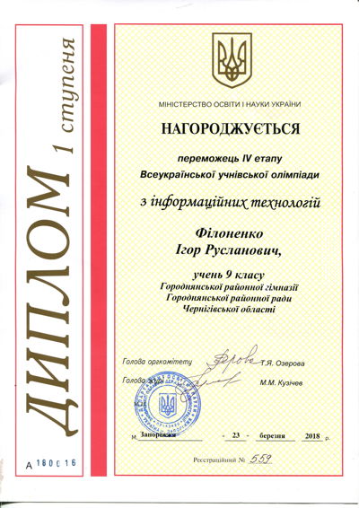 Read more →Вітаємо переможця ІV етапу Всеукраїнської учнівської олімпіади з інформаційних технологій учня 9-Б класу Філоненка Ігоря! До речі, Ігор також отримав дипломи І ступеня за фінальний етап Всеукраїнської учнівської інтернет-олімпіади з інформаційних технологій (6-9 лютого 2018 року, м. Київ) та в […]