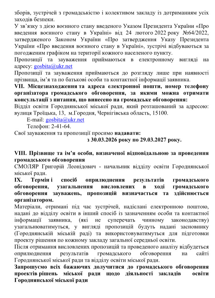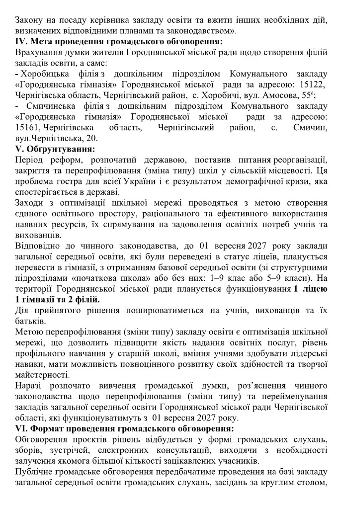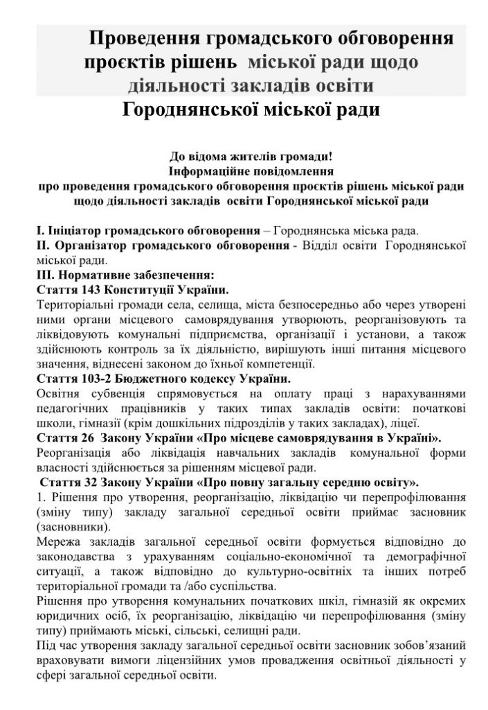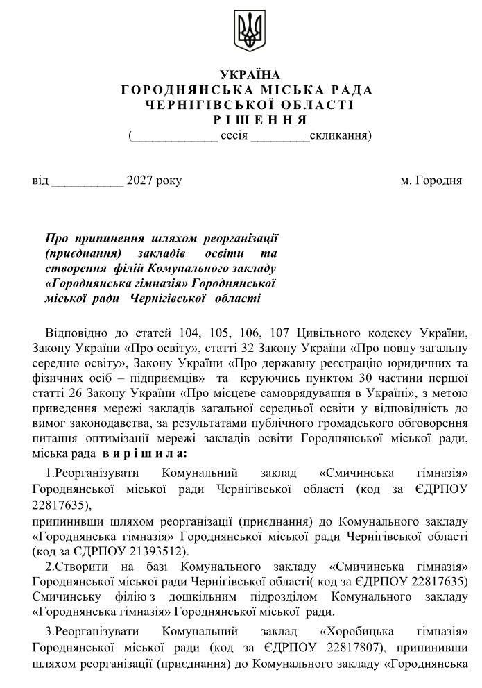 Проведення громадського обговорення проєктів рішень міської ради щодо діяльності закладів освіти Городнянської міської ради 2 Квітня, 2026 Новини